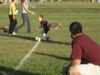 Eli had his first soccer game last night and he had a lot of fun. His team is the Landslides and though there is no official score they did 'win'. I was pretty impressed the majority of the time we were heading toward the correct goal and all the kids had fun.